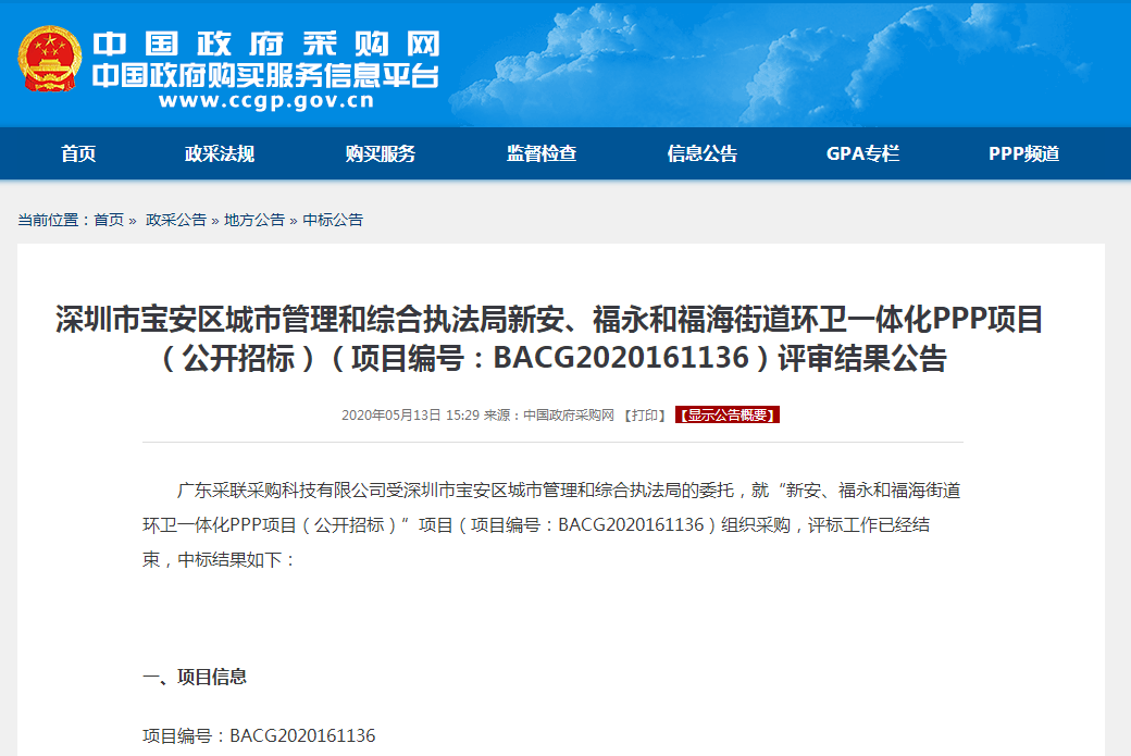 5月13日,备受瞩目的84亿深圳市宝安区新安、福永和福海街道环卫一体化PPP项目(项目编号:BACG2020161131)在深圳市宝安区公共资源交易中心评标室组织了评审,经评审小组评议,最终由长沙中联重科环境产业有限公司以第一位推荐社会资本排名,取得了该项目的运营资格。