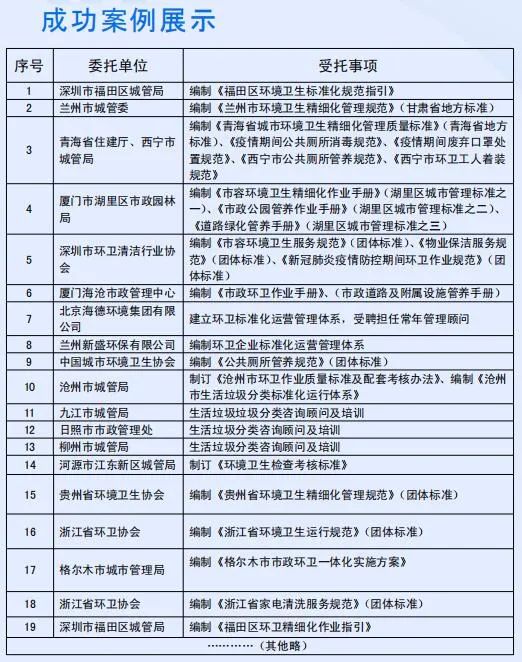 作为专业的第三方机构,深圳方圳通过长年累月的持续积累和积淀,不断对标和整合国际国内先进城市环卫管理经验,以更宽广的视野、更精准的视角、更专业的态度,先后主导了深圳市福田等区城管局、厦门湖里区市政园林局、青海省西宁市城管局等二十多个城市的环境卫生规范与标准、相关配套考核细则、精细化作业指导手册及市场化方案的编制,打造“样板”,深圳方圳在一个个的项目实践中,赢得了政府的信赖和民众的满意。