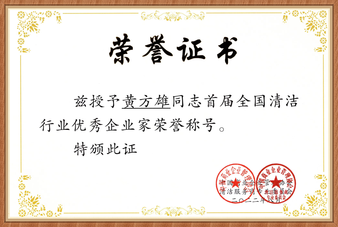 在“2022年全国清洁行业优秀企业家”会议上,深圳方圳董事长黄方雄荣获“首届全国清洁行业优秀企业家”称号。